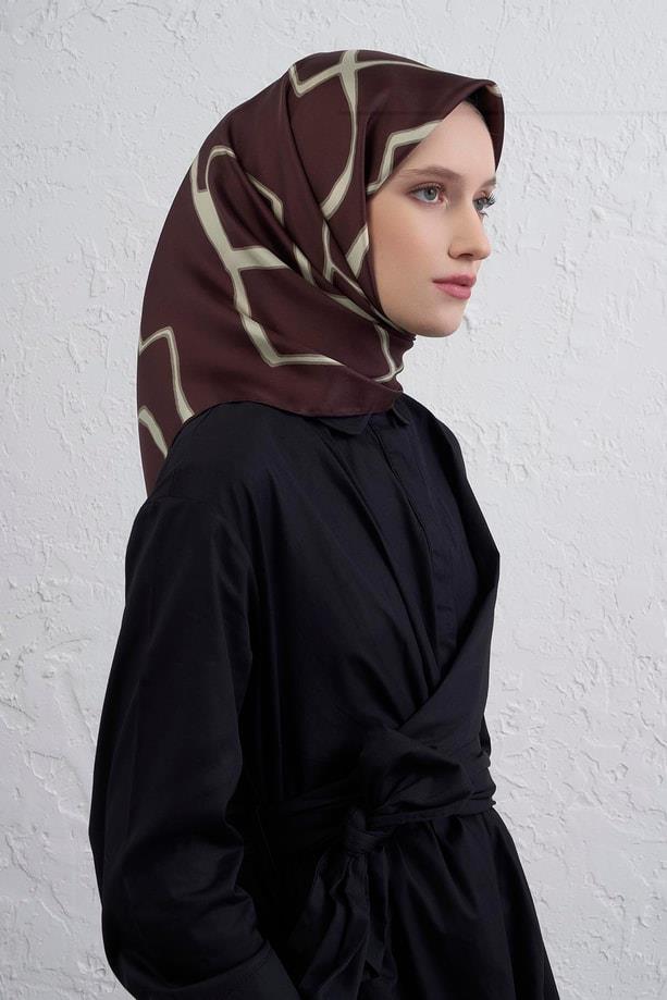 Kahverengi zemin üzerine yerleştirilmiş ekru geometrik desenlerle tasarlanan bu eşarp, sade şıklığı modern detaylarla buluşturuyor; doğal tonları sevenler için zarif ve kullanışlı bir seçenek sunuyor.