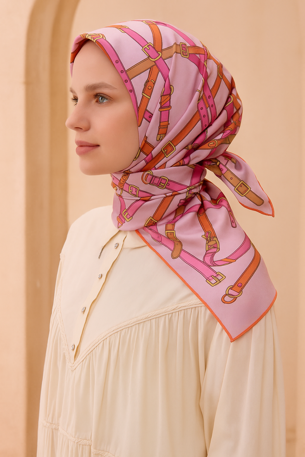 Belli Tivil Saf İpek Eşarp 4200 - 04 Açık Pembe Kemer Desen