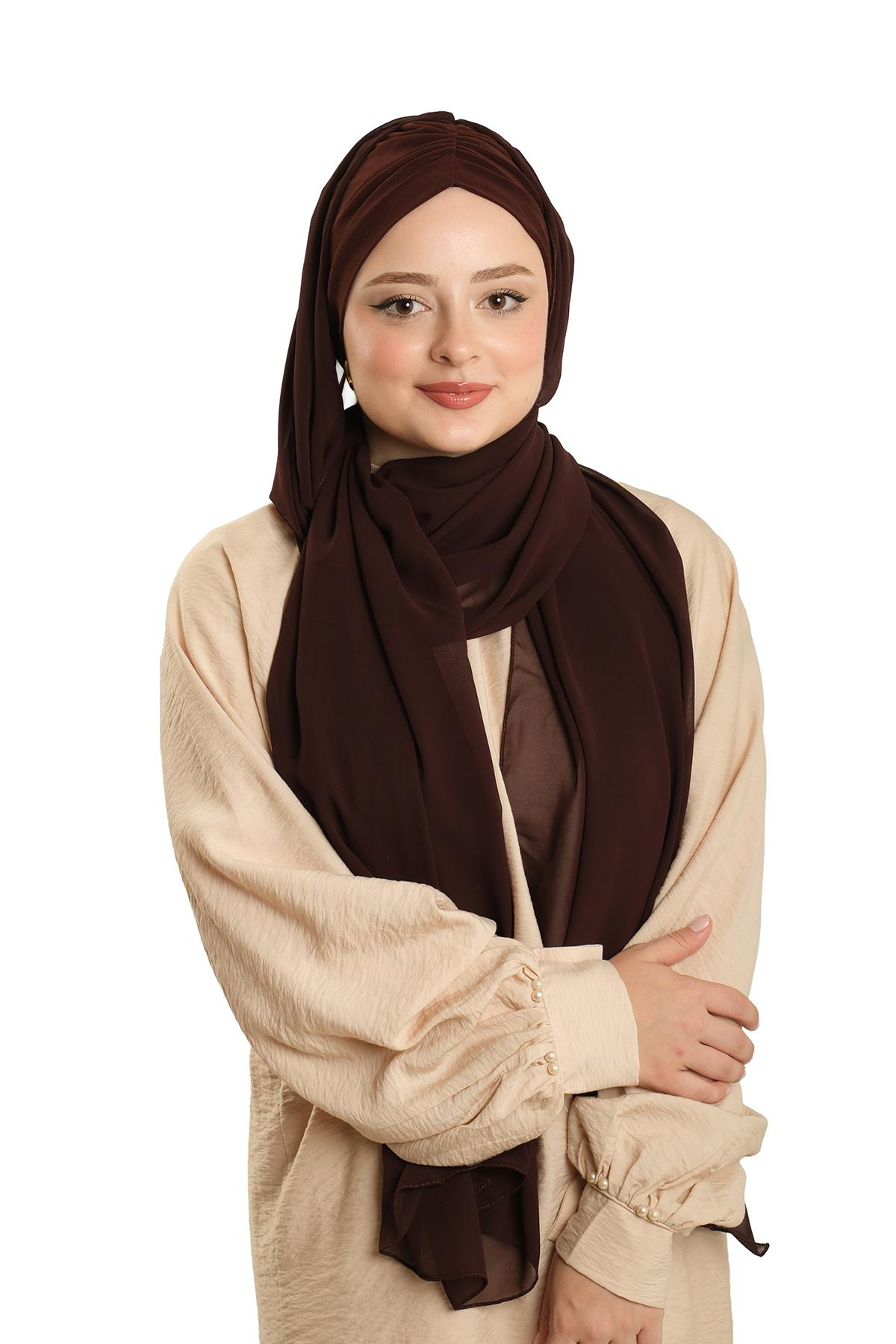 Kahve Pratik Hazır Geçmeli Bone Şal Şifon Drapeli 2507_14 (2507_14)